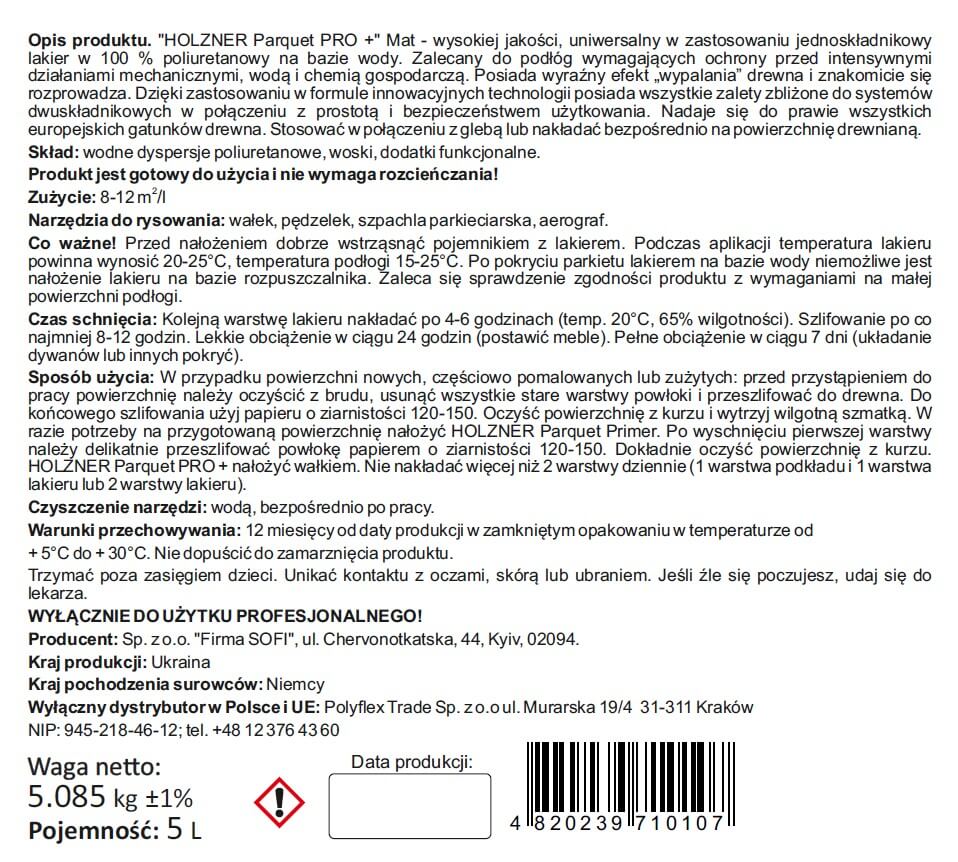 PARKIET PRO + Mat – jednoskładnikowy lakier wodny, 100% poliuretan. Posiada wszystkie zalety zbliżone do systemów dwuskładnikowych w połączeniu z prostotą i bezpieczeństwem użytkowania. Przeznaczony do powierzchniowego powlekania parkietów i podłóg drewnianych w miejscach o średnim i dużym natężeniu ruchu.