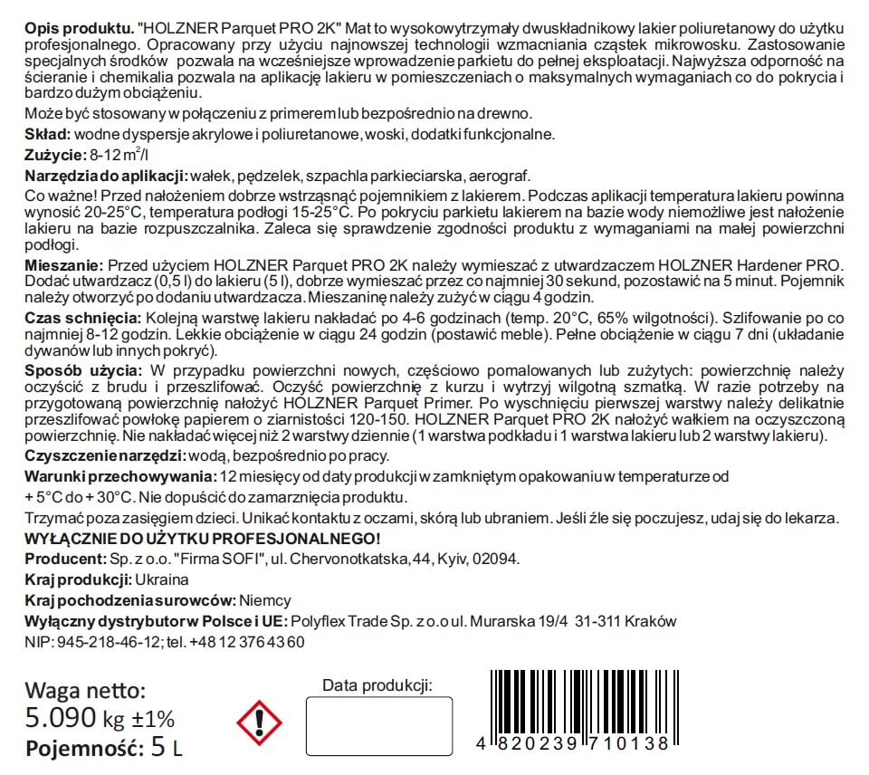 PARKIET PRO 2K Połysk Mat – dwuskładnikowy lakier poliuretanowy do parkietów i podłóg drewnianych. Najwyższa odporność na ścieranie oraz odporność na działanie chemikaliów pozwala na nakładanie lakieru w miejscach o maksymalnych wymaganiach dotyczących powłoki i bardzo dużym natężeniu ruchu. Tylko do użytku profesjonalnego.